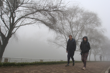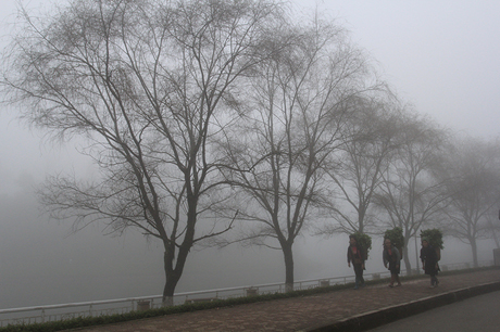 Hàng cây bờ hồ trong làn sương mờ ảo