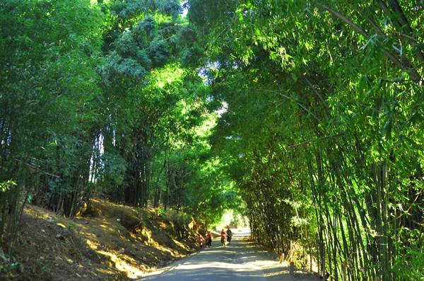 Du khách thích thú đi dạo trên đoạn đường tre xanh ngắt. |