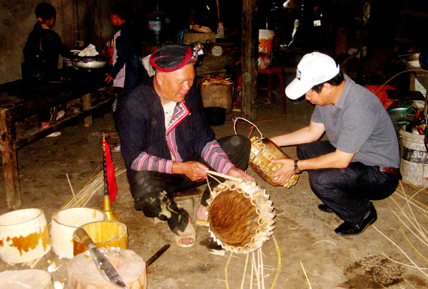 Du khách tìm hiểu nghề làm trống của người Dao ở Sa Pa.